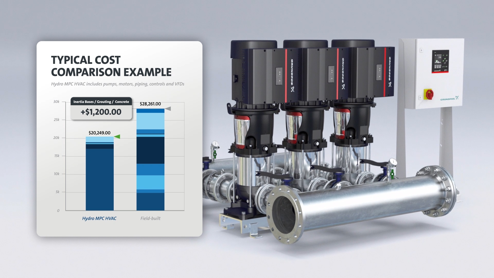 We create a 3D animated video for Grundfos HydroMPC , an award-winning integrated packaged pumping system to communicate how it stands out from the rest base on savings, efficiency, ease of use, and performance. This video was translated into different languages for global use.